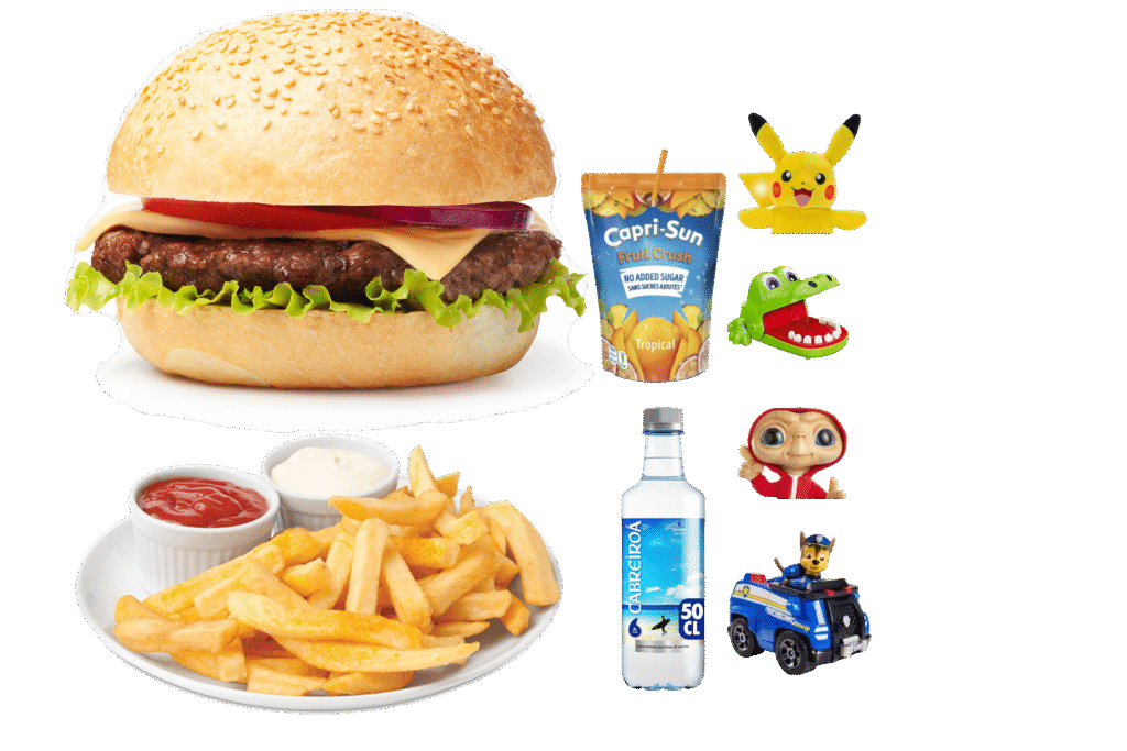 Hamburguesa de Ternera , Patatas , Zumo/Agua, Un juegette