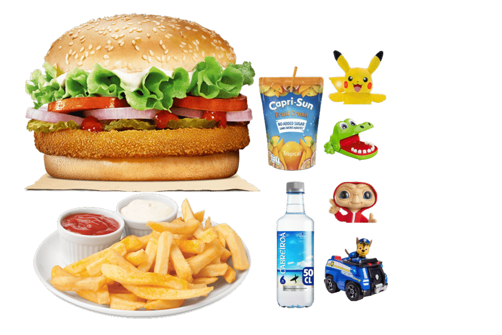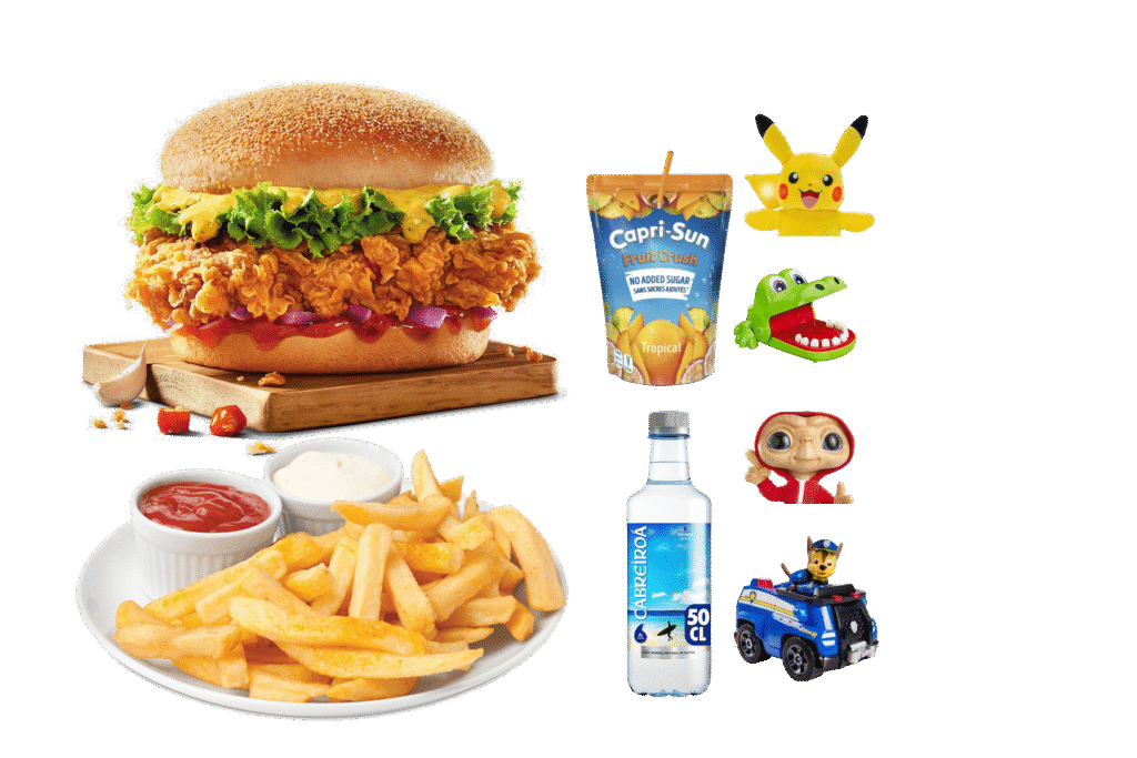 Hamburguesa de Pollo , Patatas , Zumo/Agua, Un juegette