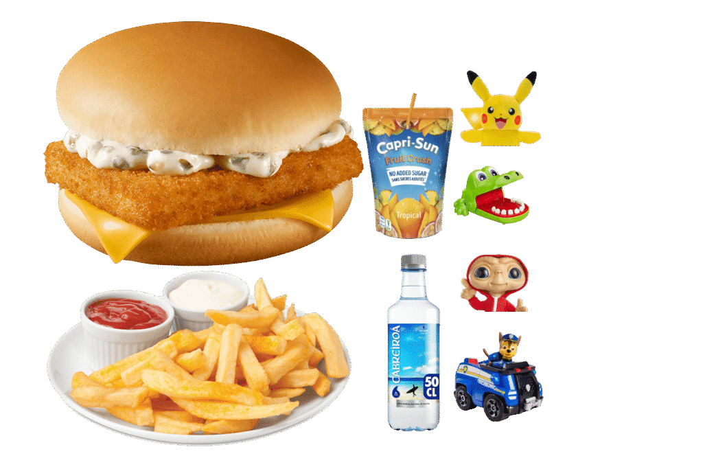 Hamburguesa de piscado, Patatas , Zumo/Agua, Un juegette