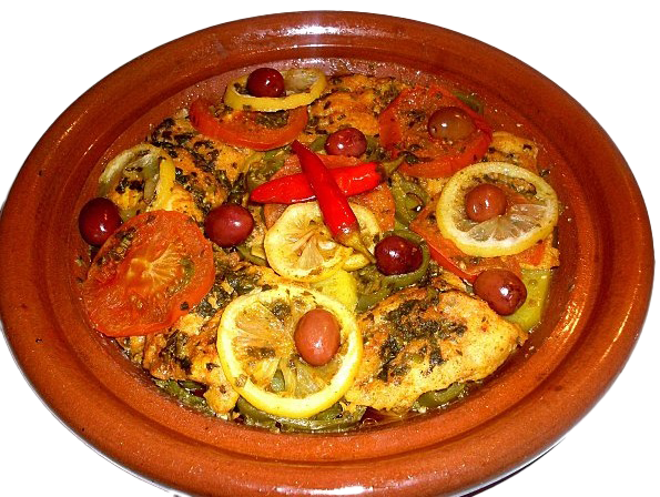 Tajín marroquí de pescado: guiso en olla de barro con filetes de pescado (merluza o dorada), tomates, pimientos, aceitunas y limón encurtido, sazonado con chermoula (cilantro, ajo, pimentón). Fresco, picante y cítrico.