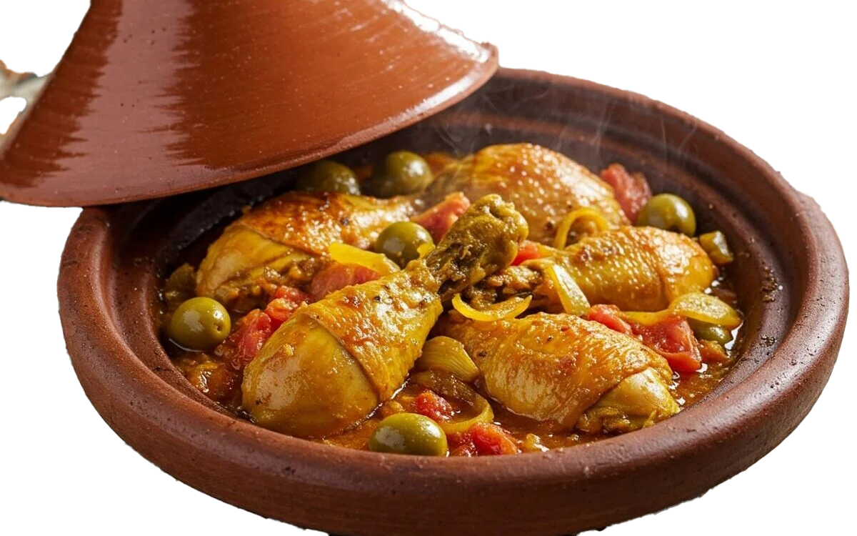 Tajín de pollo marroquí: estofado aromático en cazuela de barro con pollo, cebollas, albaricoques secos y mezcla de especias (canela, cúrcuma, cilantro). Dulce-salado y jugoso.