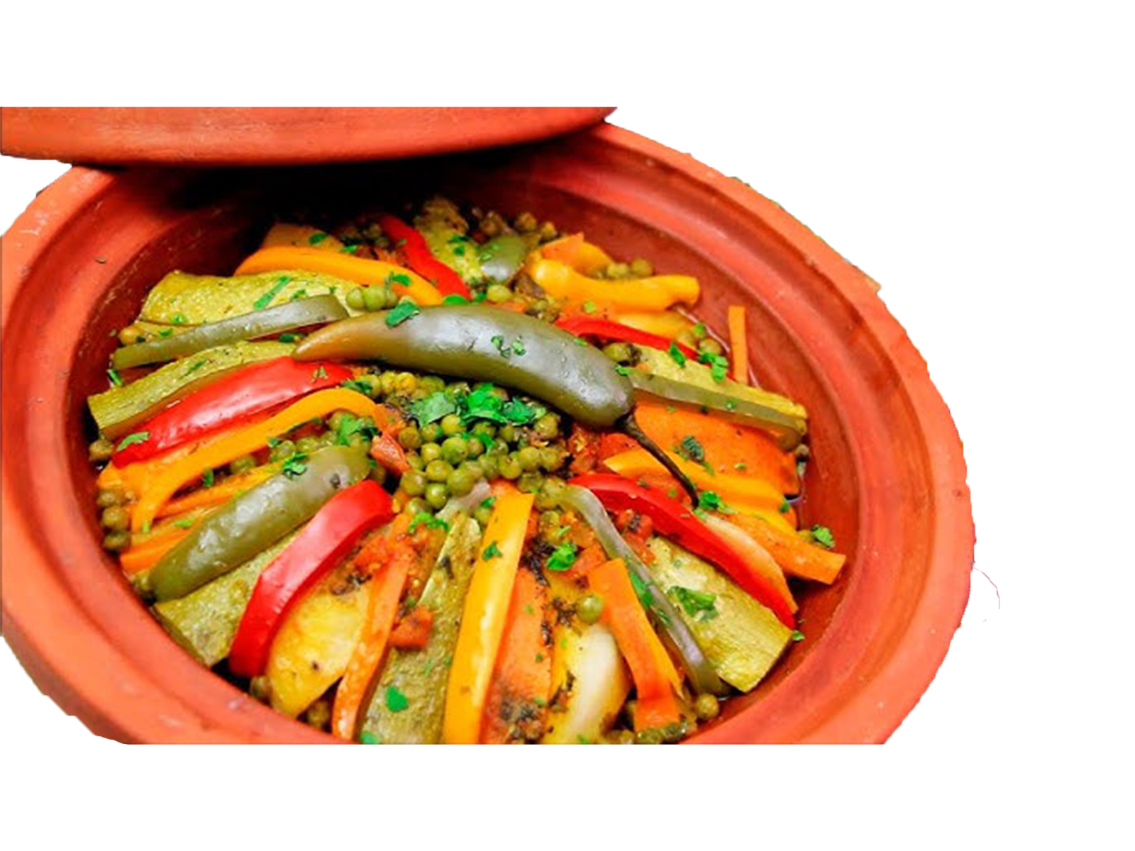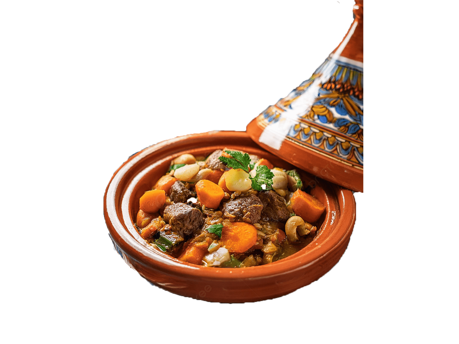 Tajín de ternera con verduras: estofado marroquí en cazuela de barro con ternera tierna, zanahorias, patatas, calabacines y cebollas, sazonado con comino, canela y jengibre. Aromático y jugoso, con notas dulces opcionales de dátiles.
