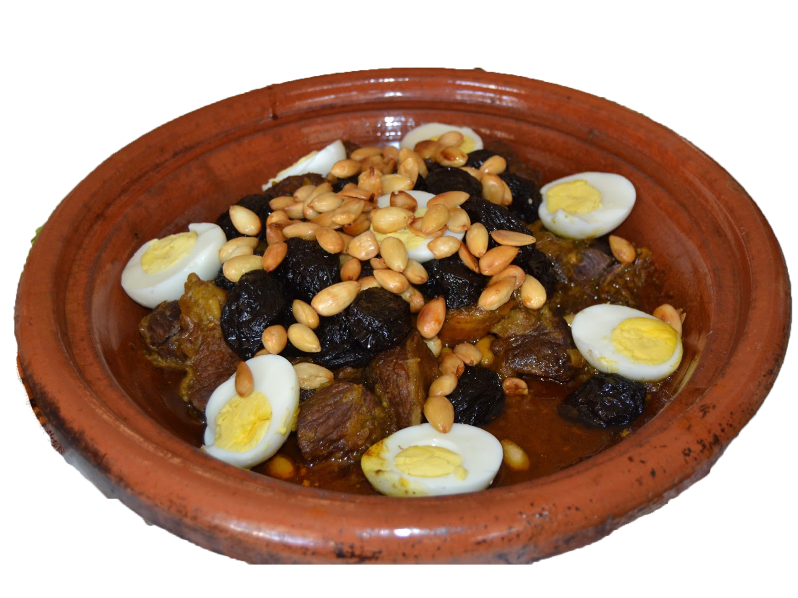 Tajín marroquí de ternera con ciruelas: guiso lento en olla de barro con ternera tierna, ciruelas pasas, cebollas y especias (canela, comino, jengibre). Dulce, jugoso y exótico.